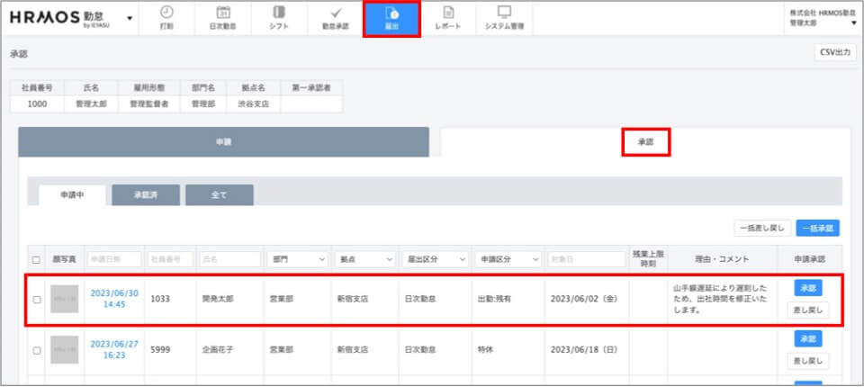 勤怠データ修正の申請内容をご確認いただき、「承認」ボタン(もしくは「差し戻し」ボタン)をクリックしてください。