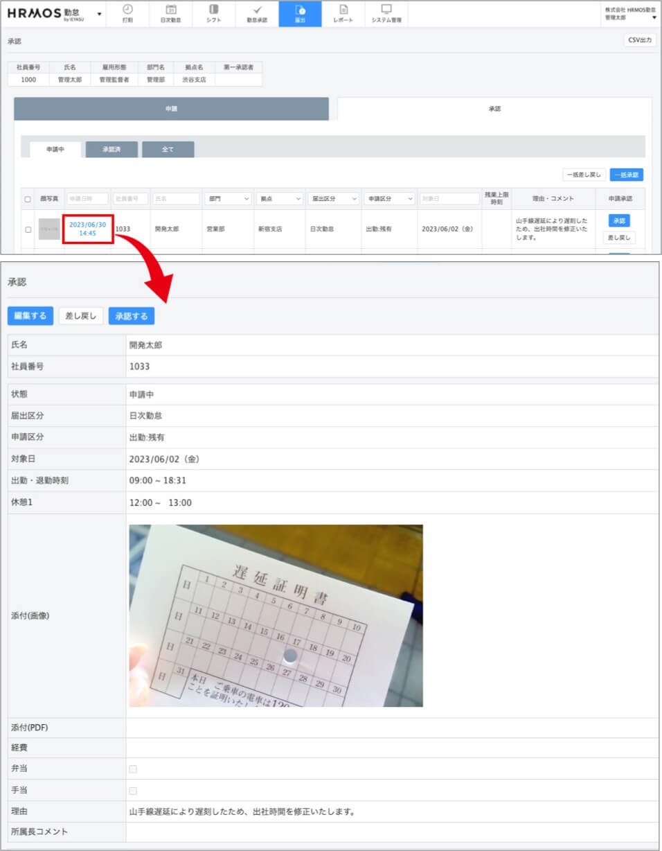 なお、申請日時のテキストリンクをクリックすると、詳しい申請内容を確認することができ、また、上長からのコメントも追記できます。