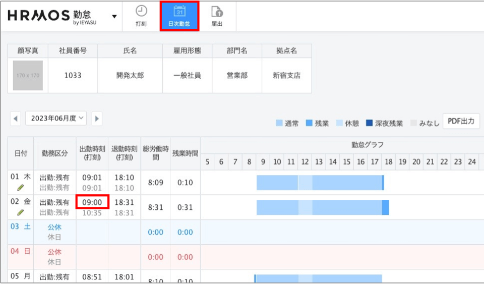 勤怠データ修正の申請が上長に承認されると、一般利用者の日次勤怠画面に自動的に反映されます。