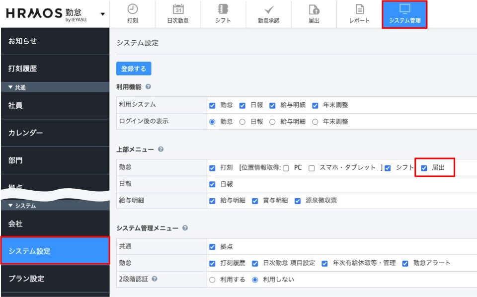 [システム管理>システム設定]画面より、「届出」にチェックを入れて「登録する」ボタンをクリックします。