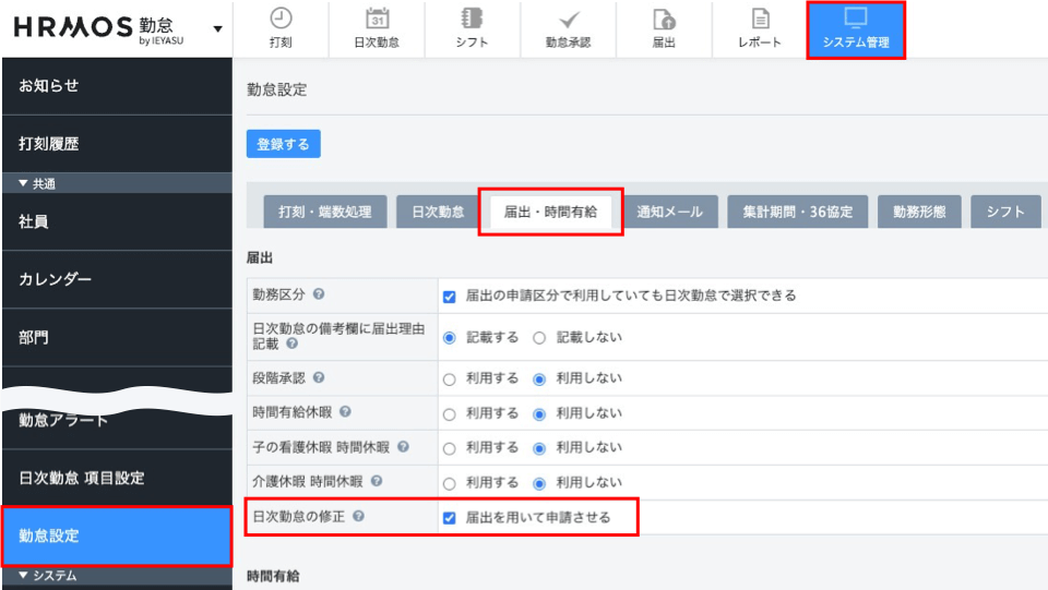 [システム管理>勤怠設定>届出・時間有給]画面より、「日次勤怠の修正:届出を用いて申請させる」にチェックを入れて、「登録する」ボタンをクリックします。