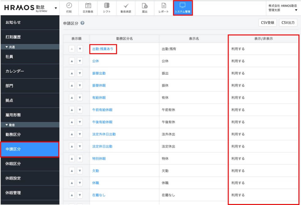 [システム管理>申請区分]画面より、すべての勤務区分の「表示/非表示」を「利用する」と設定します。編集する際は、勤務区分名のテキストリンクをクリックしてください(編集画面へ遷移します)。