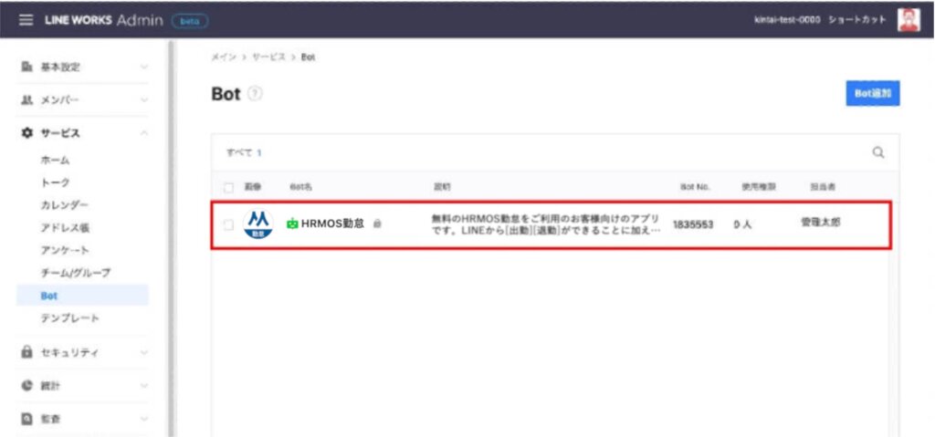 LINE WORKSの管理者画面の[サイドメニュー「サービス」>「Bot」]画面で設定を進めます。