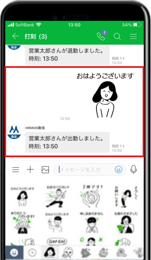 詳しくはIEYASU社が公開しているこちらのリリースをご覧いいただければと思いますが、ハーモス勤怠との連携が特に特長的なのは、文字やメニューからの打刻以外に、スタンプでも打刻できる、ということです。LINE WORKSのオリジナルスタンプで打刻できるなんで、素敵ですね。