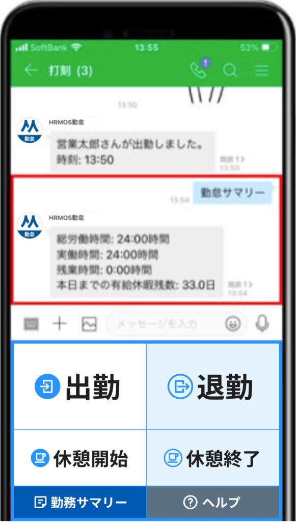 LINE WORKSはハーモス勤怠とも既に連携しており、LINE WORKSのトークから打刻が可能です。