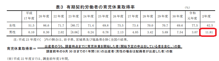 同資料では、有期契約労働者の育休取得率も公開されています。こちらを確認すると、男性有期契約労働者の育休取得率は2020年度で「11.81%」、前年度比+8.74%の大幅引き上げが見られます