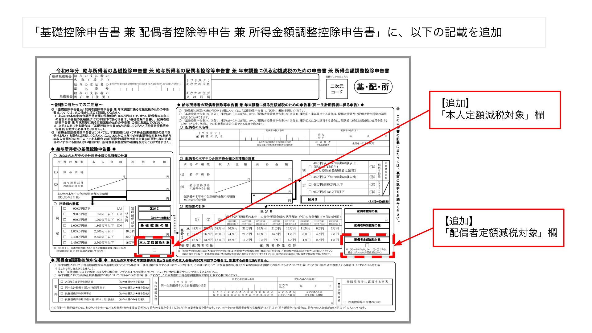 2024年6月から実施されている定額減税は、年末調整で最終調整を行う必要があります。この手続きに伴い、「基礎控除申告書 兼 配偶者控除等申告 兼 所得金額調整控除申告書」に定額減税に関する項目を追加いたしました。