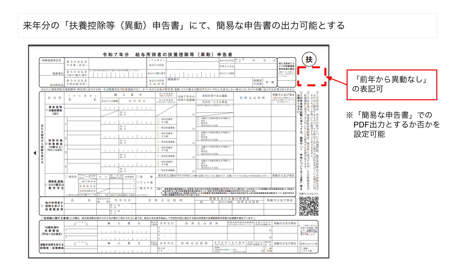 令和5年度税制改正により、扶養控除等申告書について、記載すべき事項に前年の申告内容と変更がない場合、異動がない旨を記載した申告書(簡易な申告書)を提出することができるようになりました。