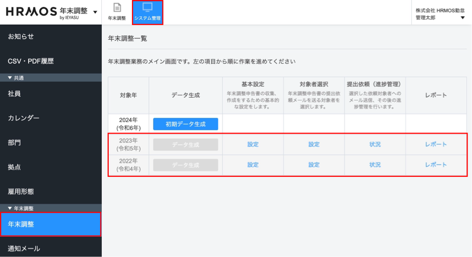 [システム管理>年末調整]画面に2024年度(令和6年)の管理画面を追加いたしました。2024年度の年末調整を進める場合は、2024年度(令和6年)の行の「初期データ生成」ボタンをクリックしてください。