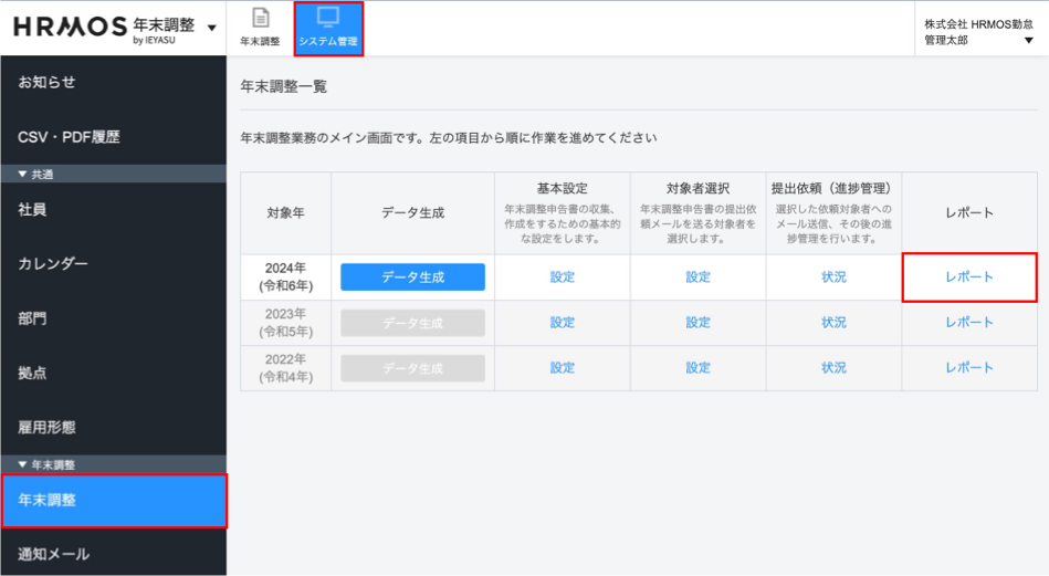 [システム管理>年末調整>レポート]画面から、年末調整の情報をPDF・CSV形式で出力できるようになりました。