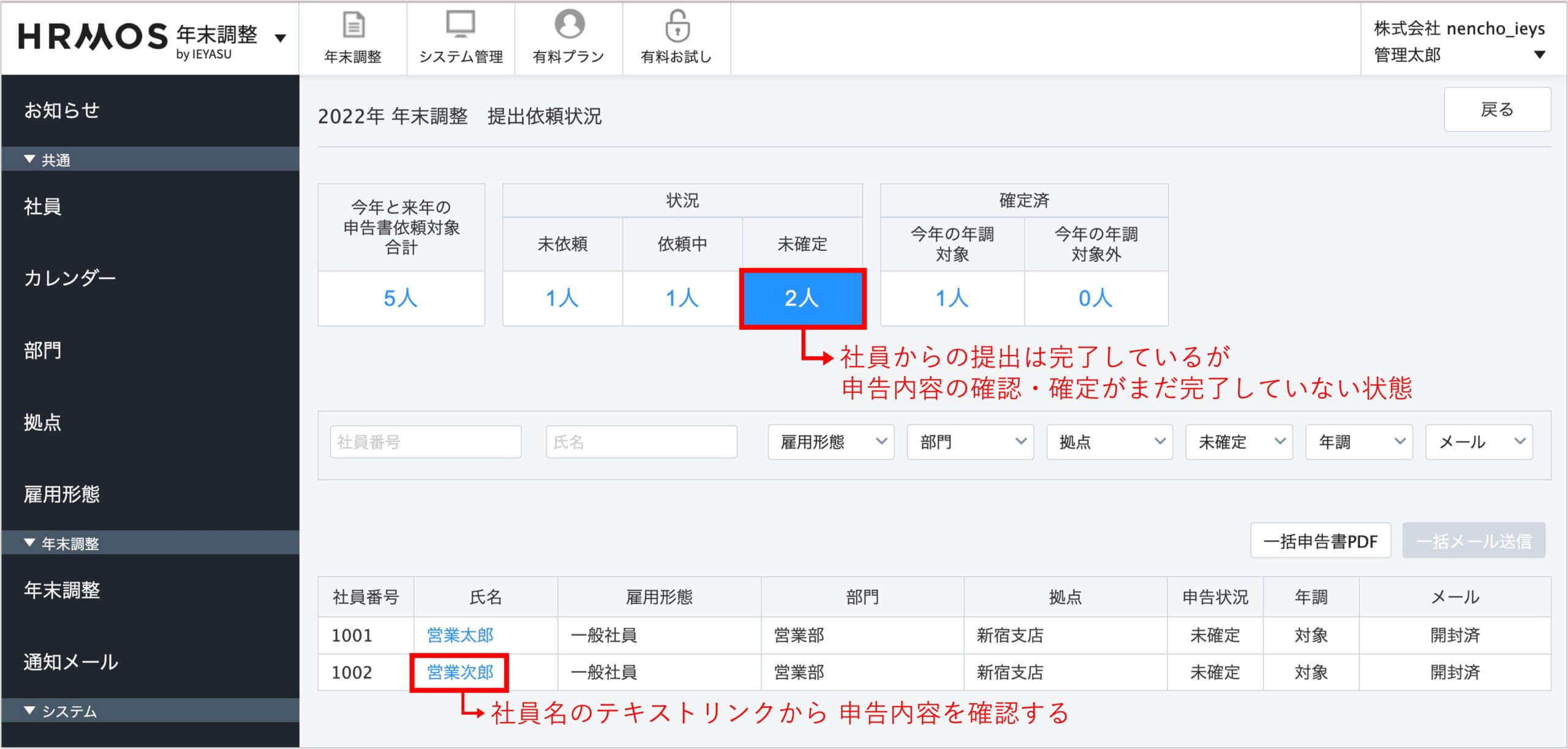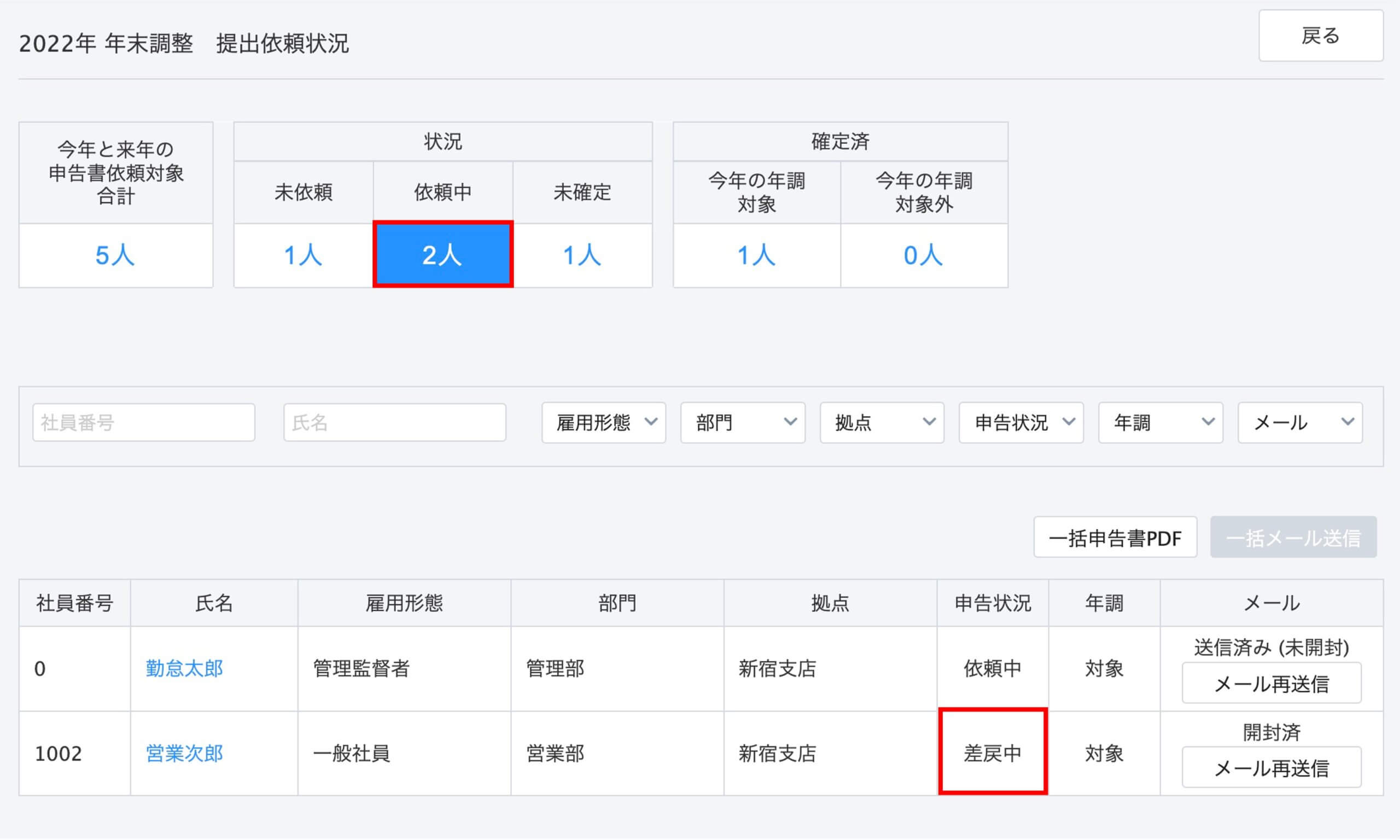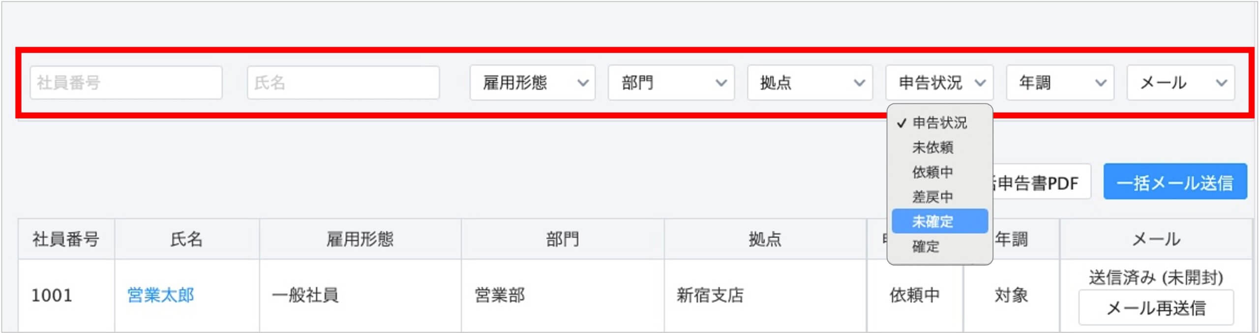 また、社員番号・氏名・雇用形態・部門・拠点・申告状況・年末調整(対象or対象外)・メール(未開封or開封済)で絞り込むことも可能ですのでご活用ください。