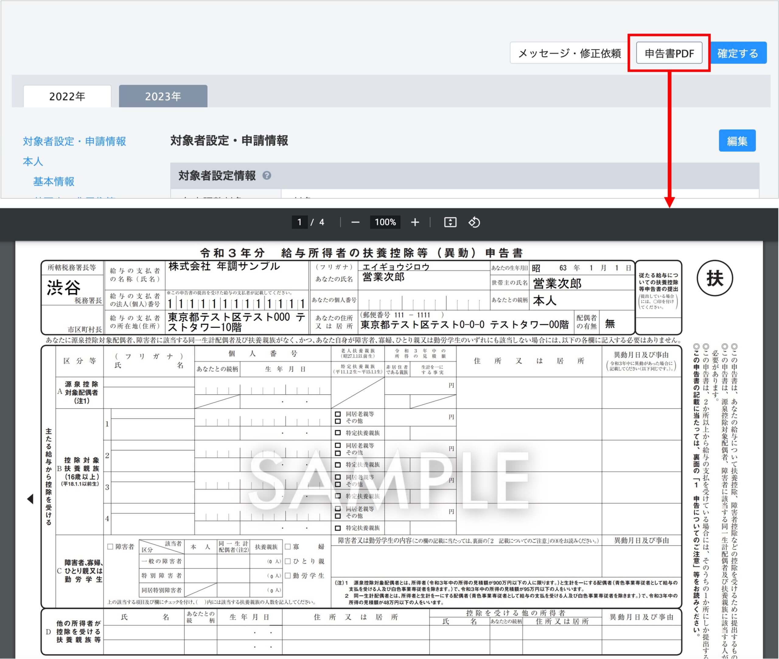 こちらの画面には、申告内容の最終チェックを行い確定させた「確定済」の社員が並びます。この画面から申告内容をCSV・PDFで出力できます。出力したcsvデータを加工し、給与計算システムへインポートしていただけますと幸いです。