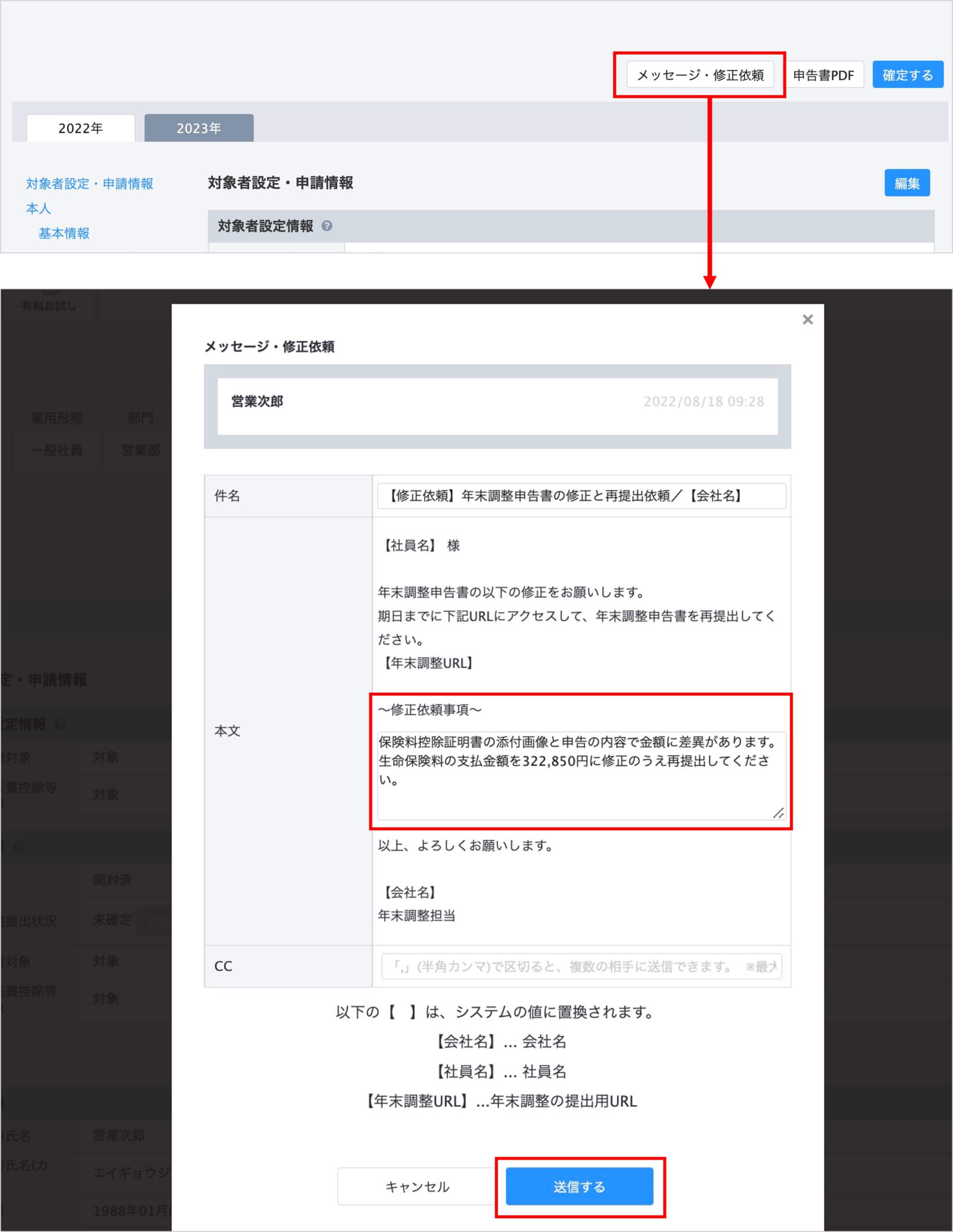 また、「メッセージ・修正依頼」のボタンからは、社員からのメッセージも確認できます。社員が年末調整申請フォームの「連絡事項等」の項目にメッセージを記載した場合、その内容が反映されますので併せてご確認ください。