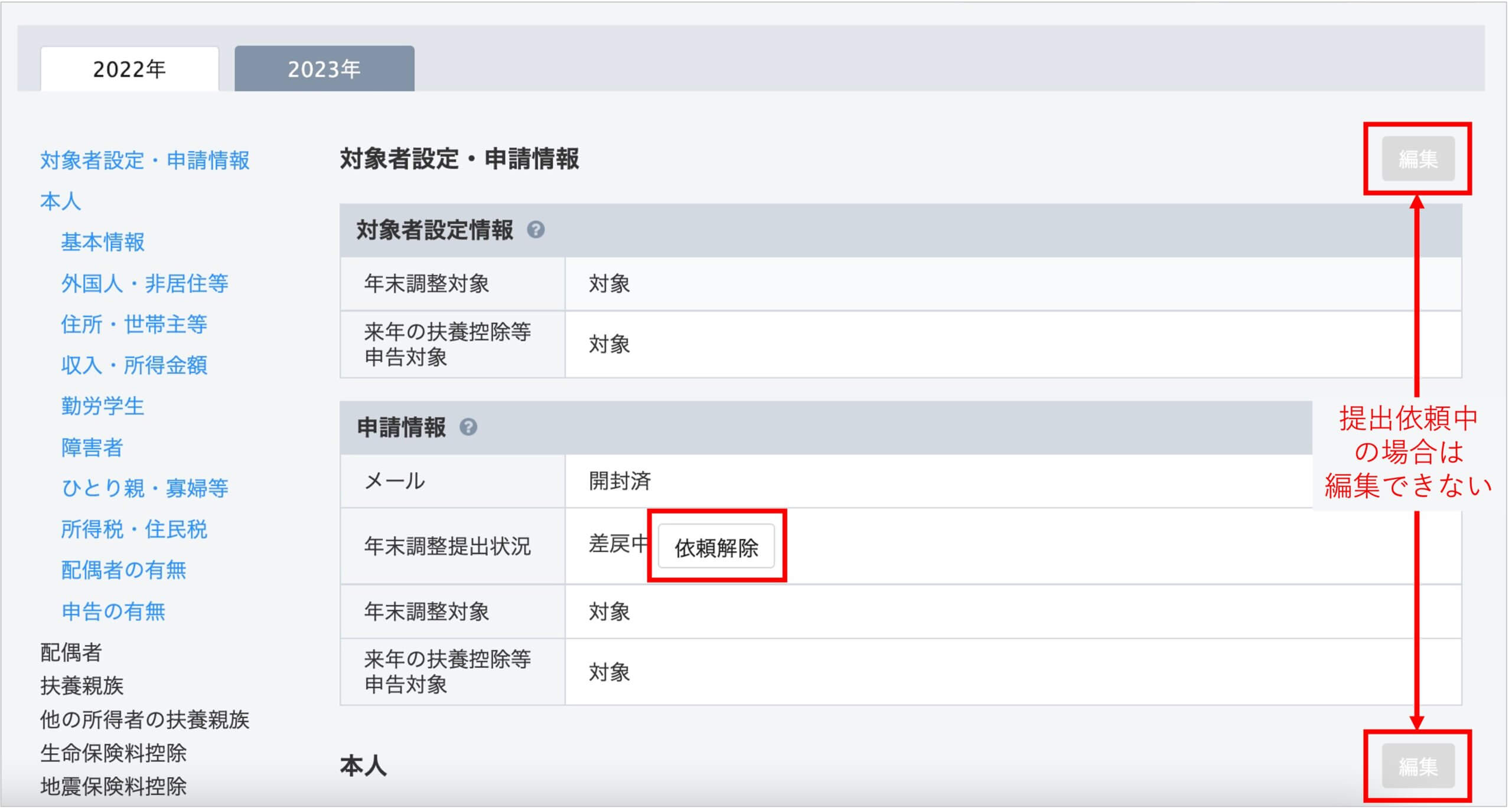 なお、社員へ提出を依頼している場合は編集ができませんので、もし編集したい場合は「依頼解除」ボタンをクリックしてください。