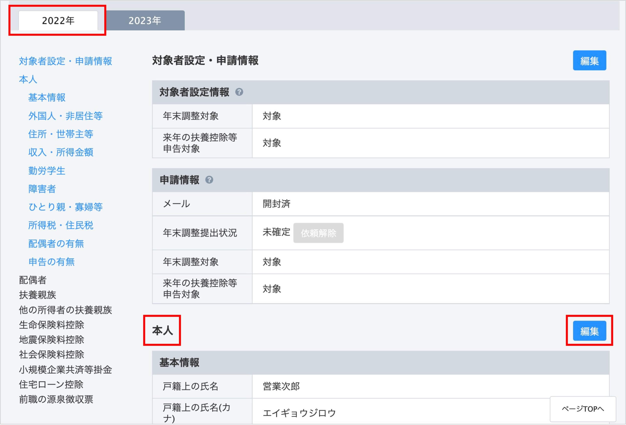 こちらの画面に、年末調整の申告内容が集約されていますので内容をご確認ください。