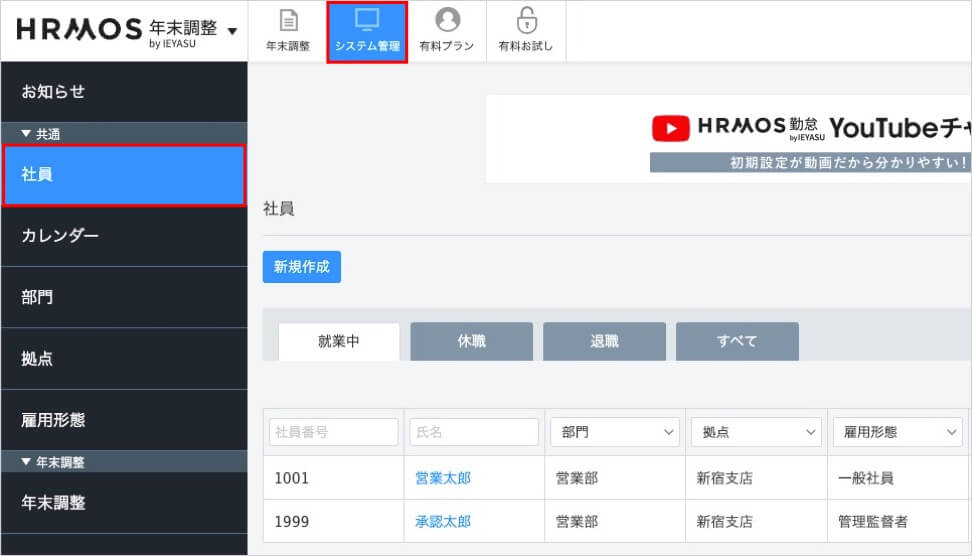 上部メニュー「システム管理」の「社員」の画面より、年末調整を行う社員を登録します。