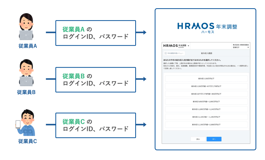 ハーモス年末調整においては、社員は自分のログインID・パスワードでシステムへログインし、年末調整申請フォームを表示させます。よって、まずは社員1人1人のアカウントを作成し、ログインID・パスワードを発行します。