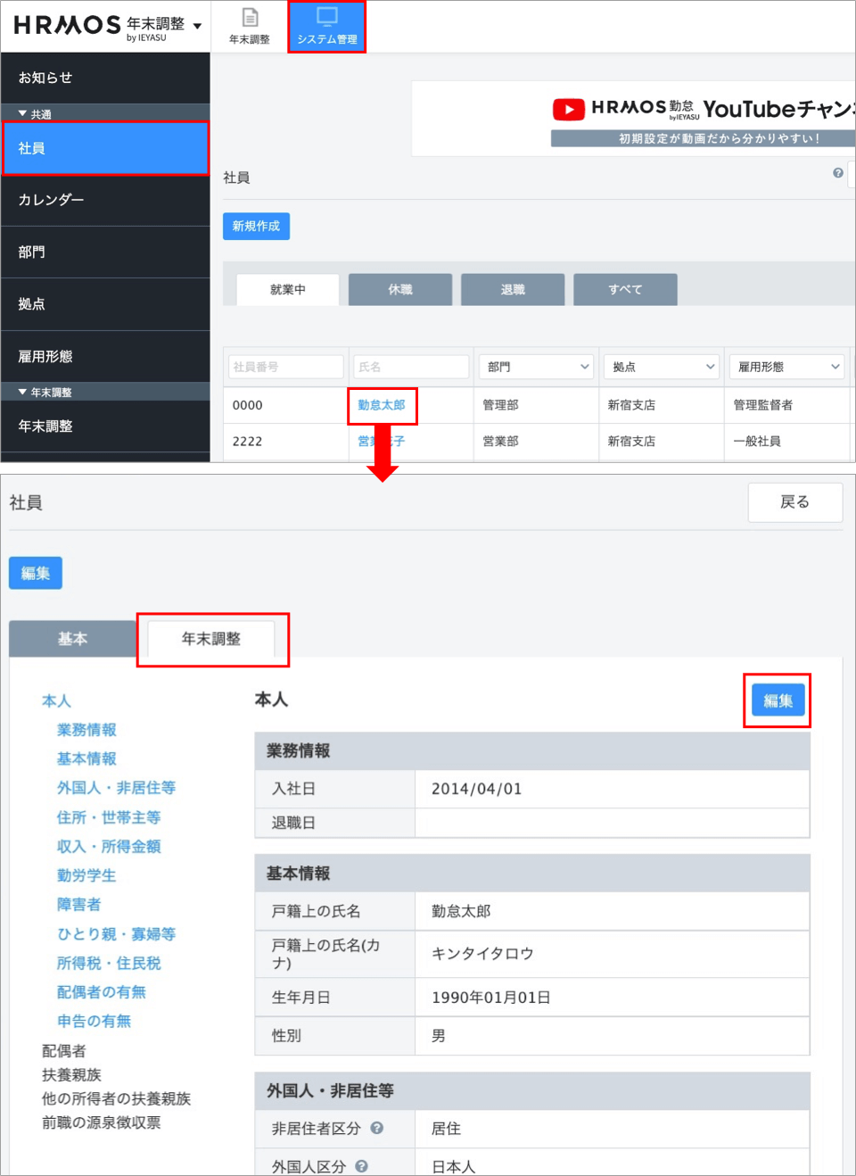 このままでも運用を開始できますが、[システム管理>社員>社員詳細画面>年末調整タブ]画面より、住所や給与所得、配偶者や扶養親族などの「年末調整に関する情報」も登録できます。