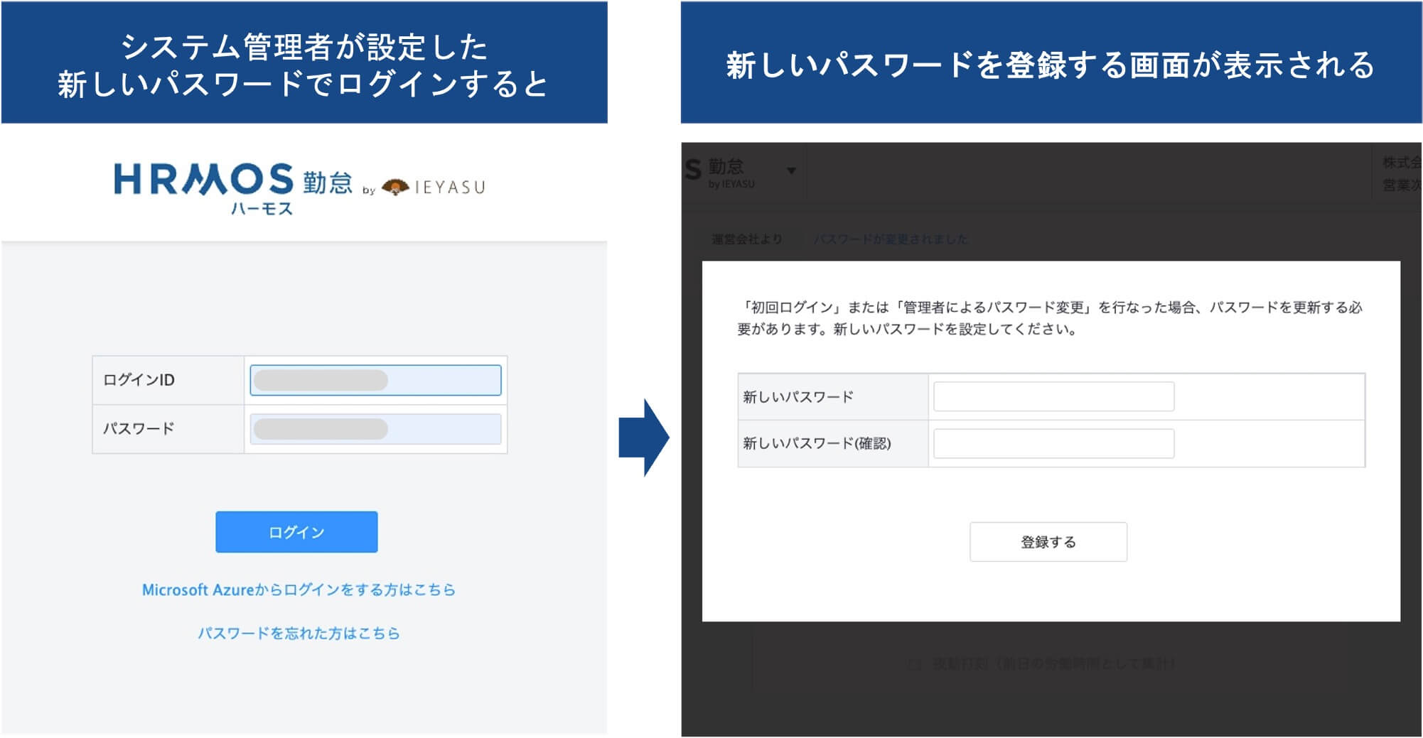 なお、システム設定画面において、『「初回ログイン」を行なった場合、社員にパスワードを設定させる』にチェックをいれておくと、案内されたID・パスワードで、社員が初回ログインをした際に、パスワードの再設定画面が表示されます。共通のメールで案内したとしても、社員自身しか知らないパスワードに 確実に変更してもらえますのでご安心ください。