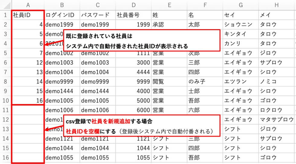 なお、csv登録の場合、1列目の社員IDをキーにして編集が行われますが、社員を新規登録する場合は1列目の社員IDは空欄で構いません。