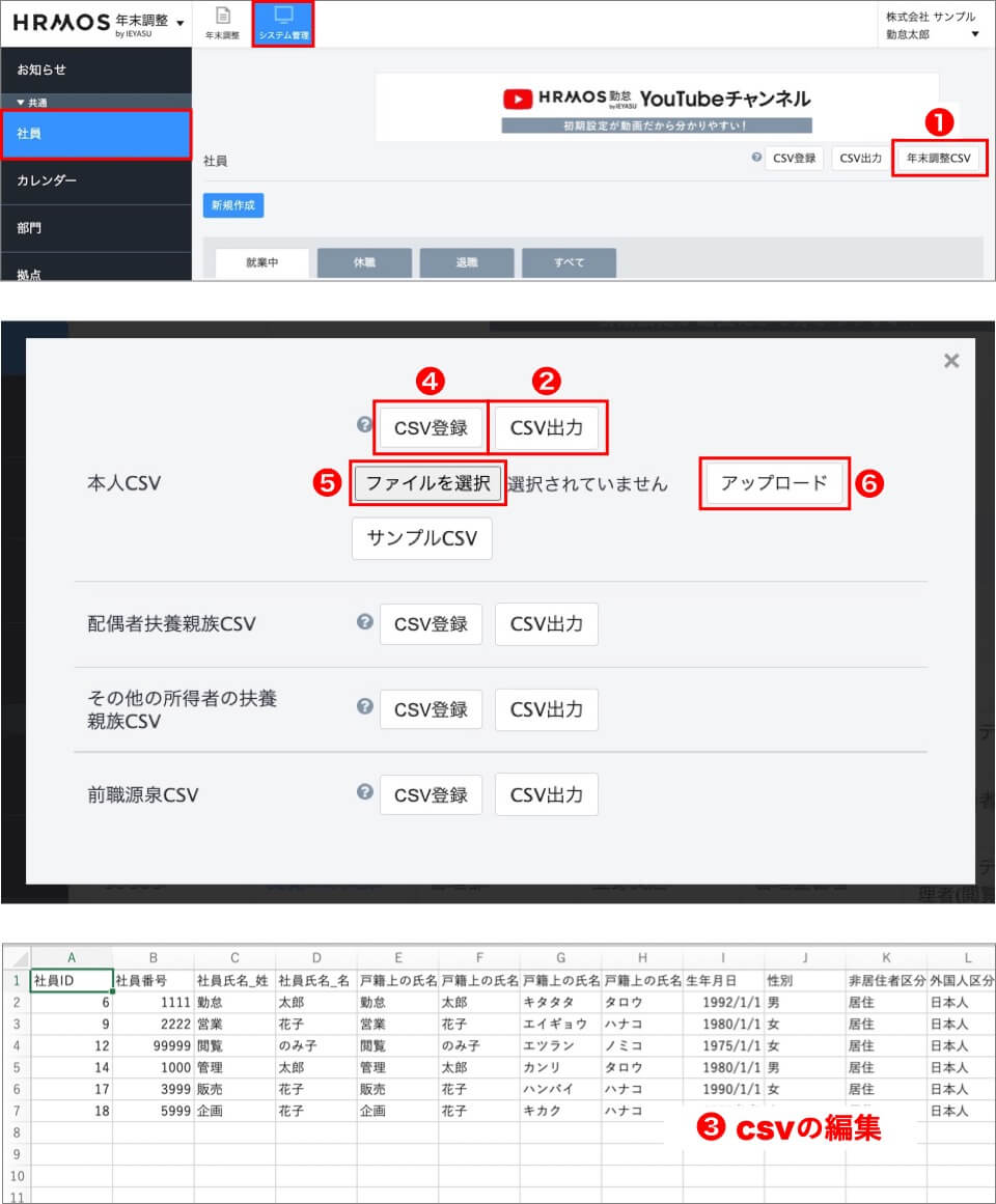 また、[システム管理>社員]画面より、csvで年末調整の情報を一括登録することも可能です。