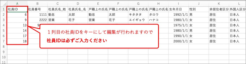 一括登録では、1列目の社員IDをキーにして編集が行われますので、社員IDは必ずご入力ください。
