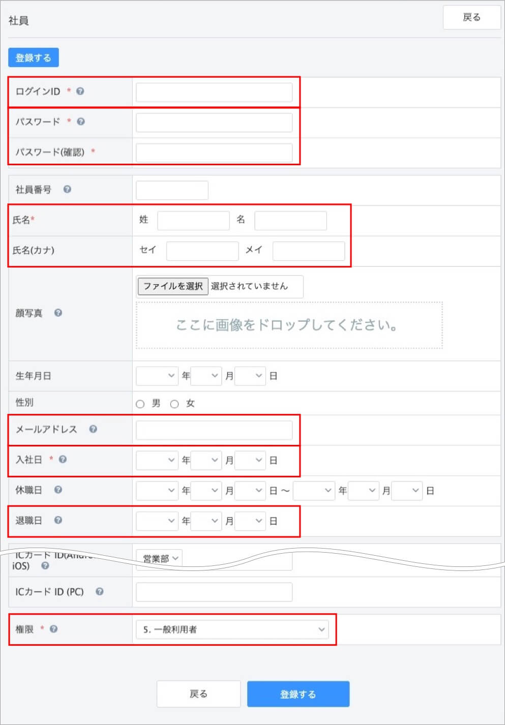 コピー登録をした場合、編集しなければならないのは「ログインID」「パスワード」「氏名」「メールアドレス」「入社日・退職日」そして「権限」の項目です。