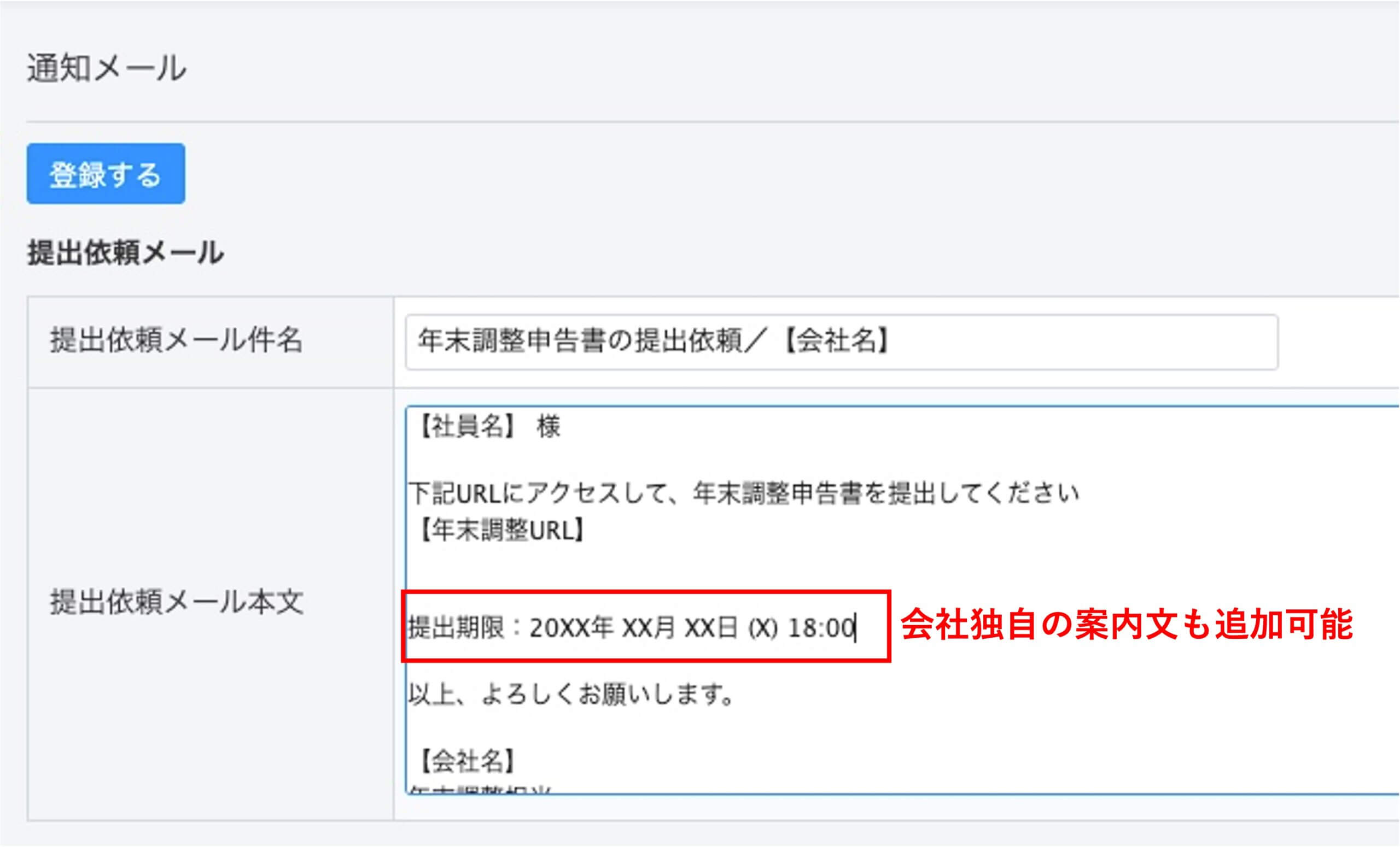 もし、会社独自の案内文を追加する場合は、「編集」ボタンをクリックし文面を編集してください。例えば、「提出依頼メール」に「提出期限」を記載したい場合は、こちらから追記をお願いします。
