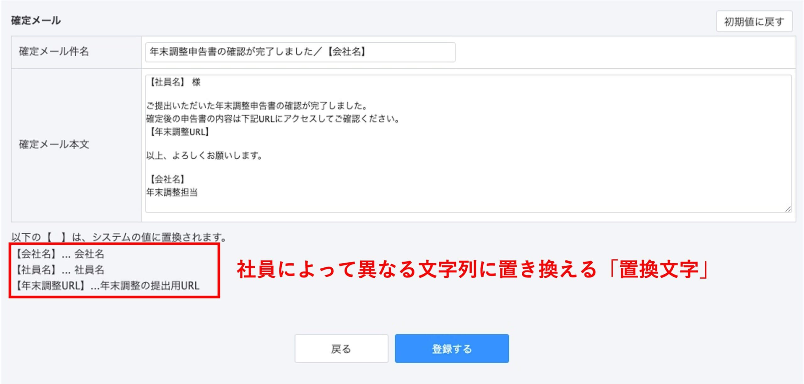 こちらでは、社員へ送信する「年末調整の提出依頼メール」「リマインドメール」「修正依頼メール」「確定メール」の文面を登録します。