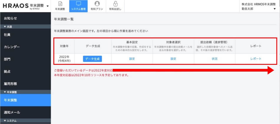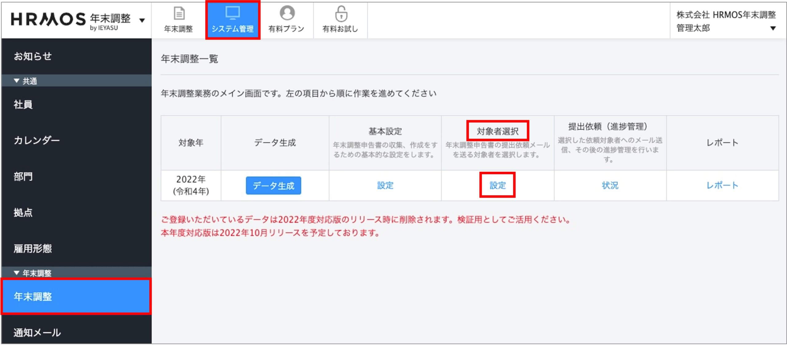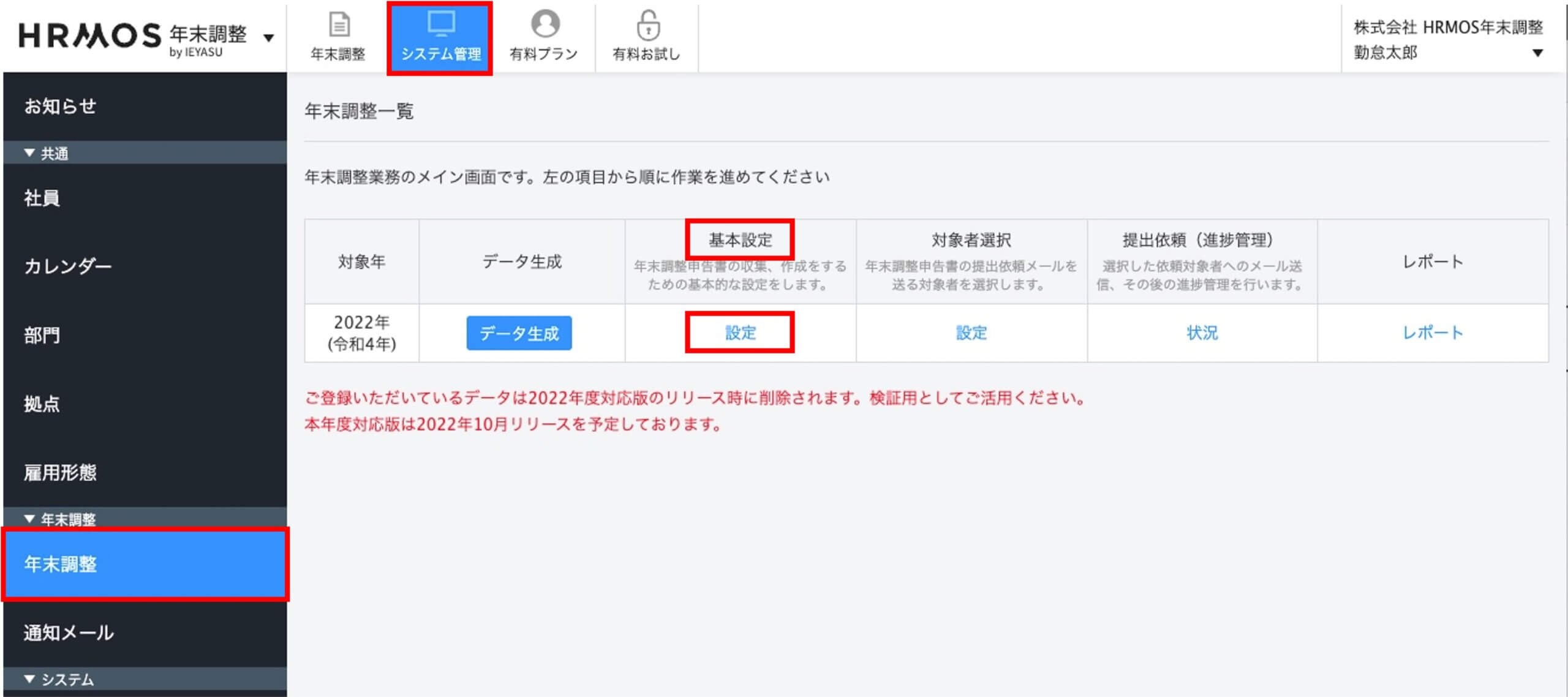 [システム管理>年末調整]画面より設定より設定を開始します。
