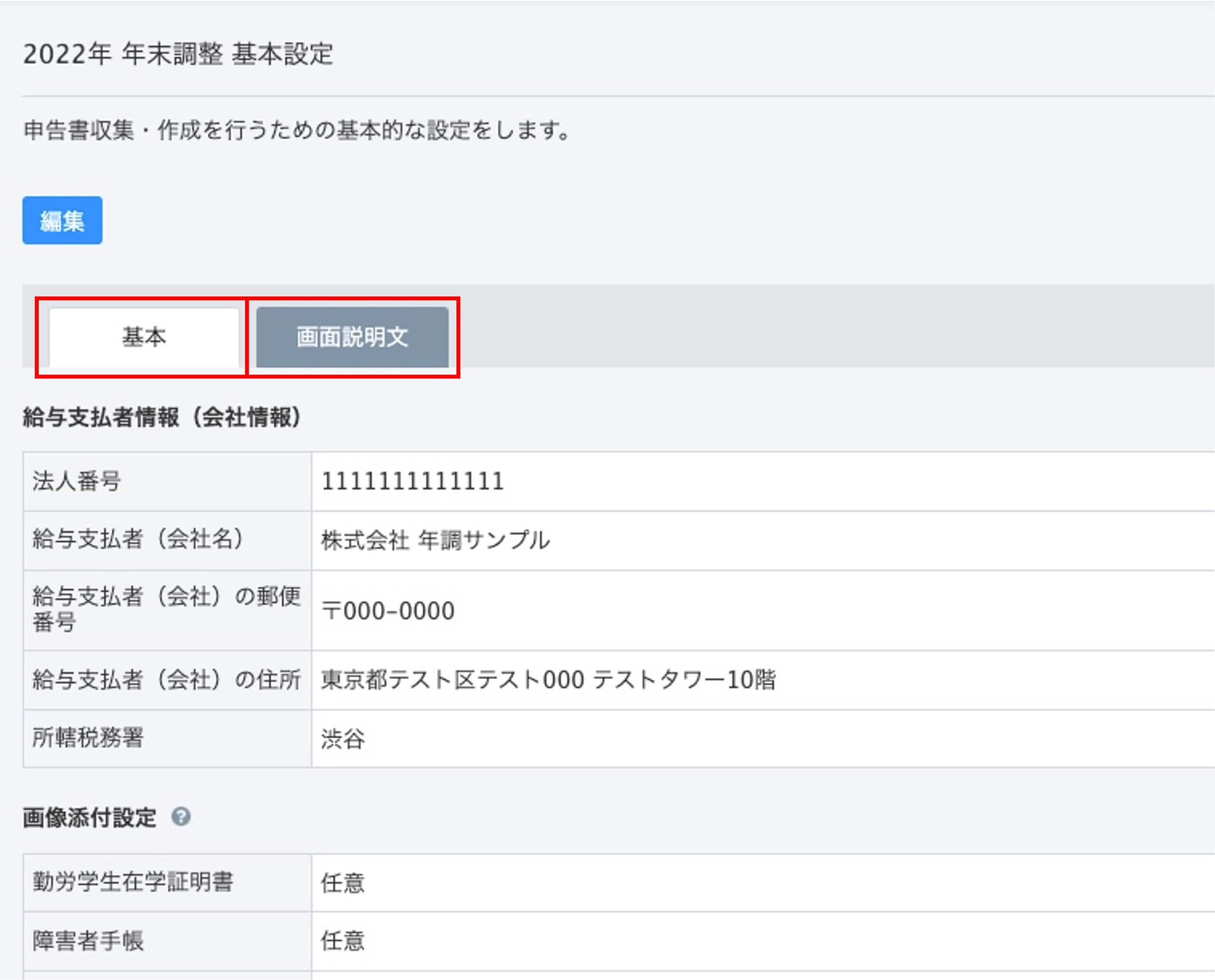 この画面では、申告書収集・作成を行うための基本設定と、年末調整申請フォームの各画面に添える説明文を登録します