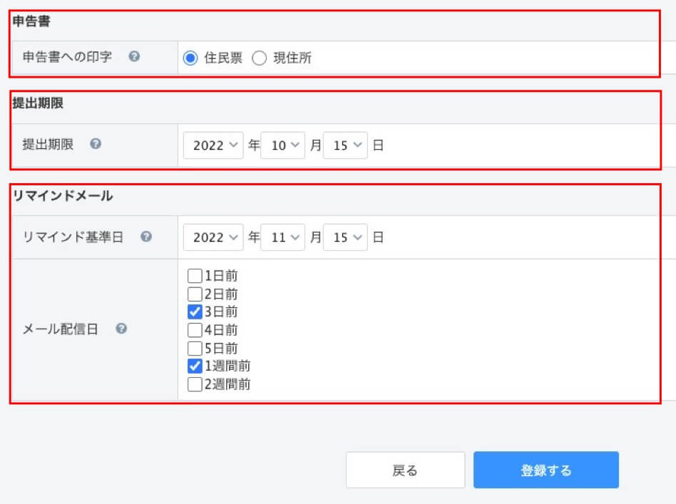 最後に、申告情報の提出を促す「リマインドメール」に関する設定です。リマインドメールを設定する場合は、「基準日」と「配信日」を設定してください。