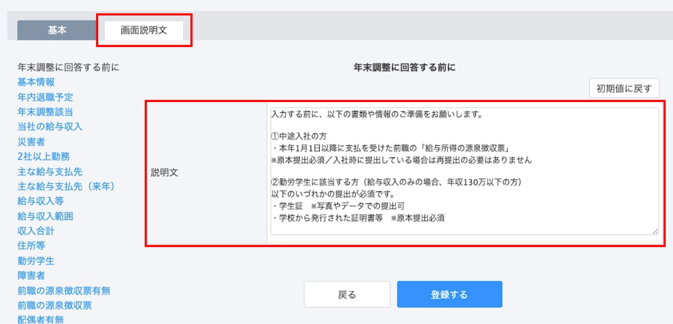 社員が申告情報の提出するための「年末調整申請フォーム」には、社員が入力で迷うことがないように「説明文」を添えることができます。その説明文をこの画面から設定します。