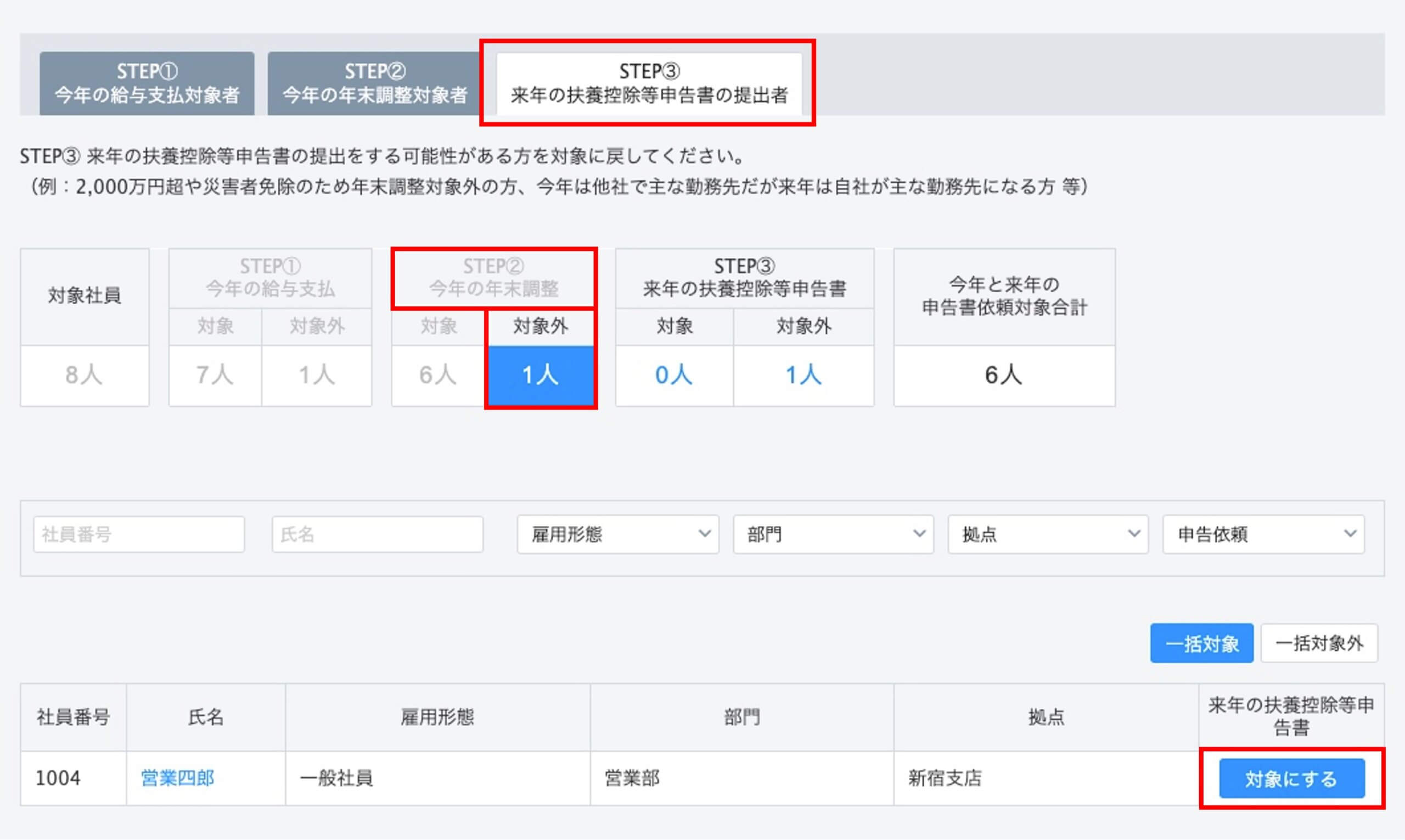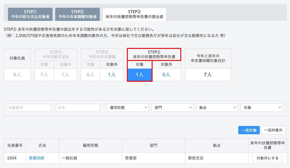「STEP③来年の扶養控除等申告書の提出者」のタブをクリックし、「STEP②」の「対象外」をクリックすると、STEP②で対象外となっていた社員が画面上に表示されます。