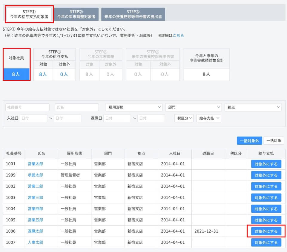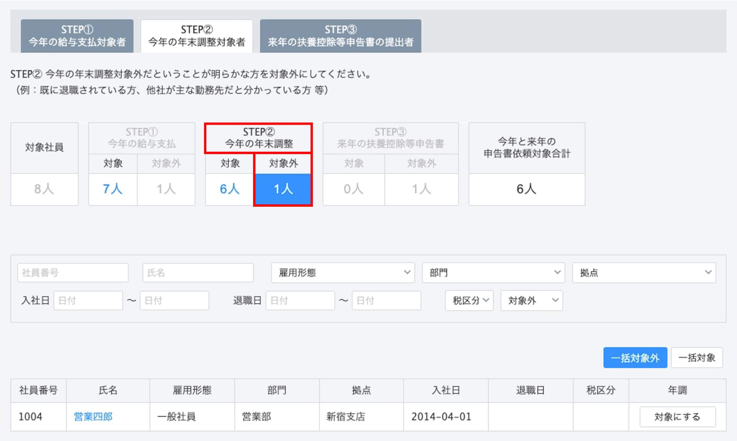 「STEP②今年の年末調整対象者」のタブをクリックし、「STEP①」の「対象」をクリックすると、STEP①で絞り込んだ対象者が画面上に表示されます。この中から「今年の年末調整対象外である方」を見つけ、「対象外にする」という青いボタンをクリックします。