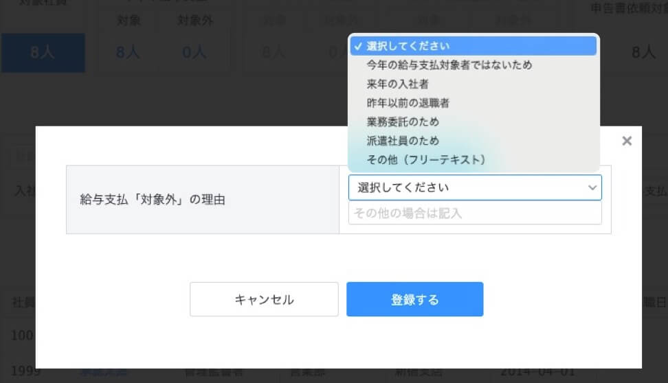 「対象外」となる理由を登録する画面が表示されますので、理由をご登録ください。