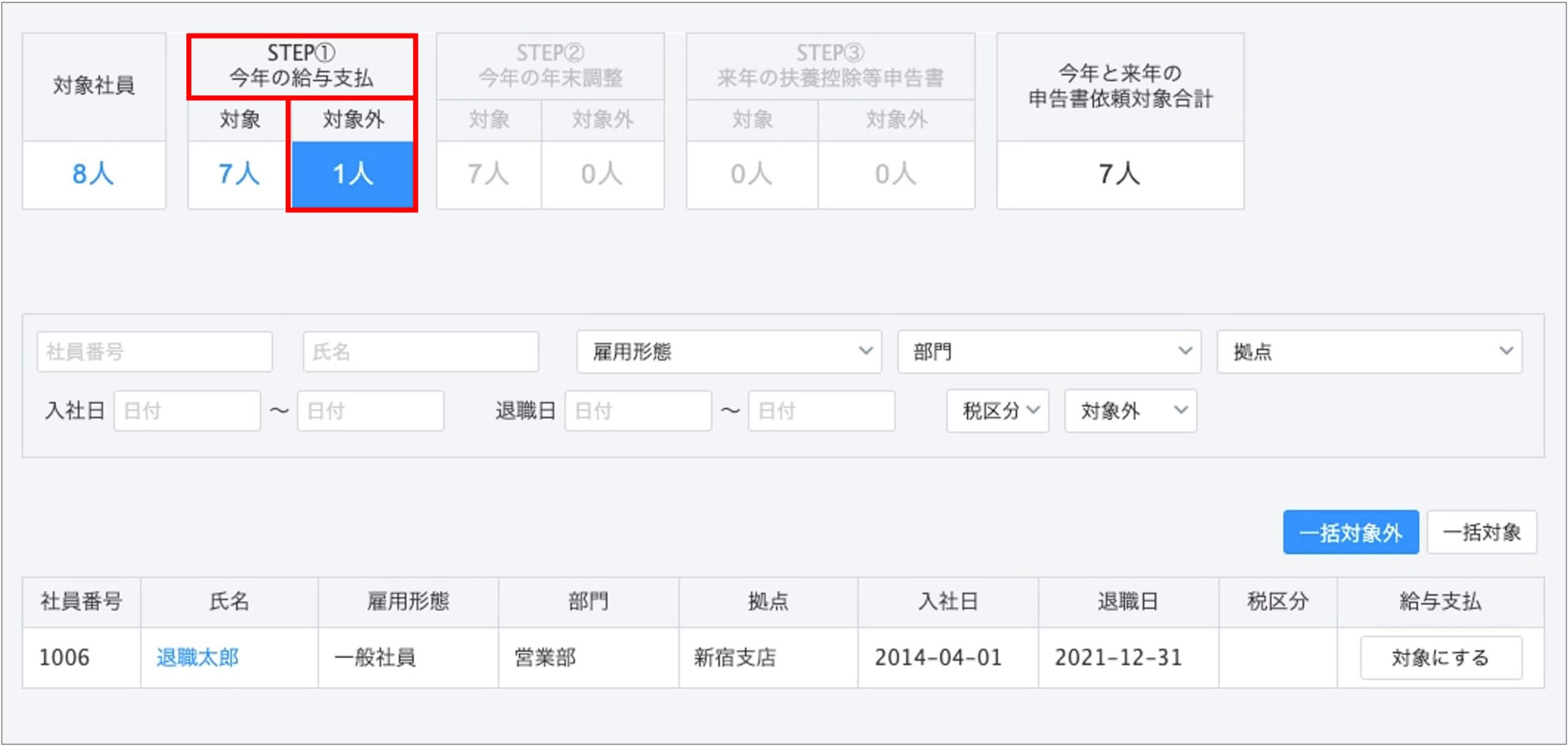 この対象者の中から、「今年の給与支払対象ではない社員」を見つけ、「対象外にする」という青いボタンをクリックします。