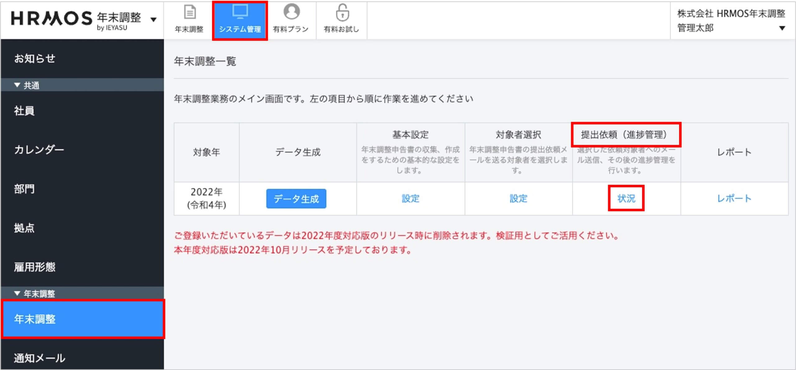[システム管理>年末調整>提出状況の「状況」]をクリックします。