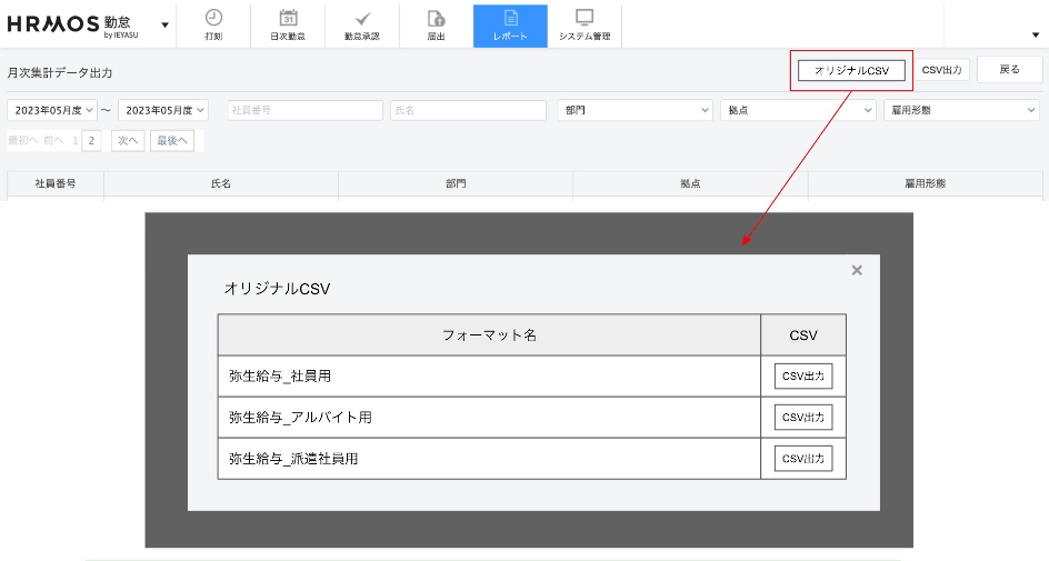 レポート画面から出力する「月次集計データ出力」「日次勤怠データ出力」おいて、オリジナルのCSV出力パターンを登録できるようになります。