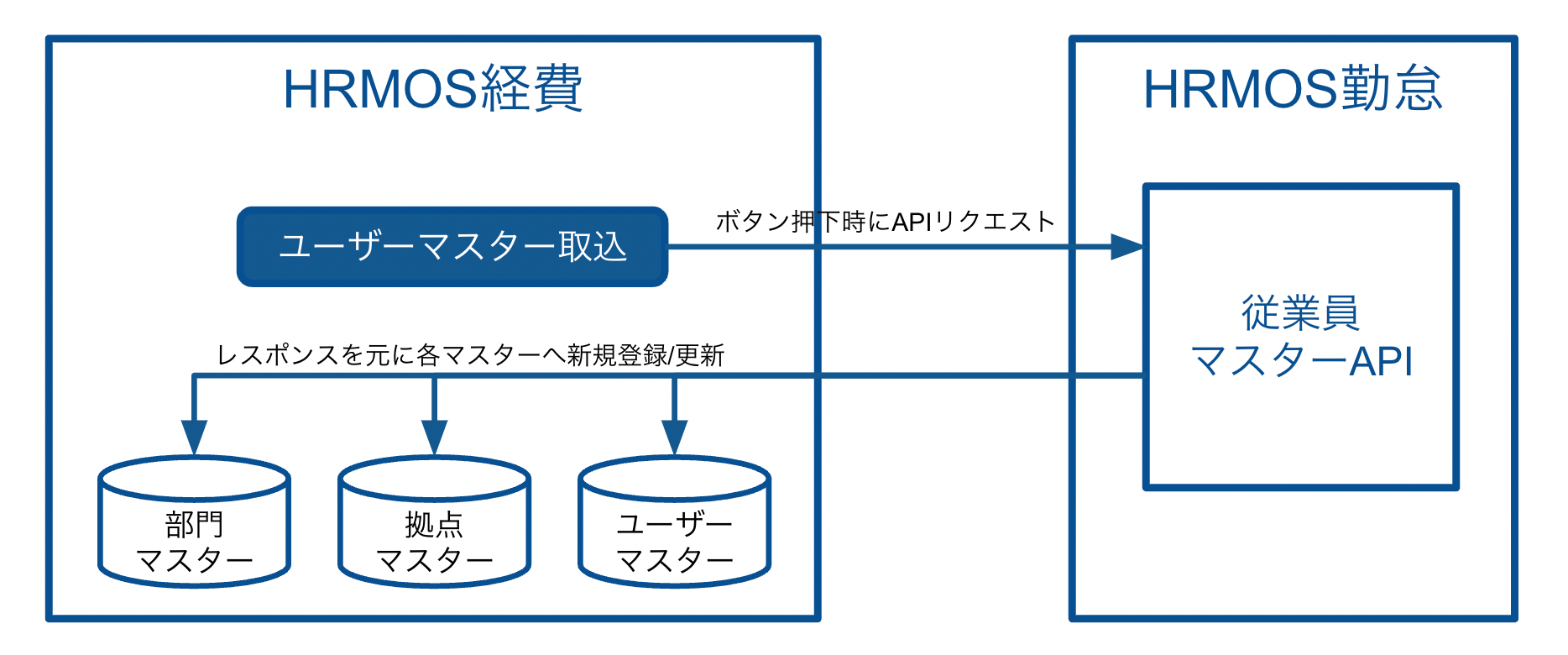 - 組織変更/人事異動時のマスター更新時、HRMOS勤怠の情報をもとに、HRMOS経費の部門マスター・拠点マスター・ユーザーマスターを更新する