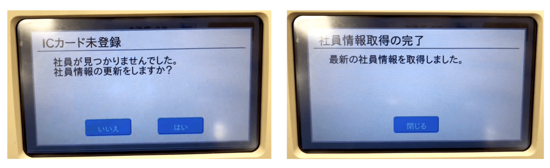 ピットタッチに反映されていなかった新しい従業員がICカードをかざすと「社員情報の更新をしますか?」というメッセージが表示されます