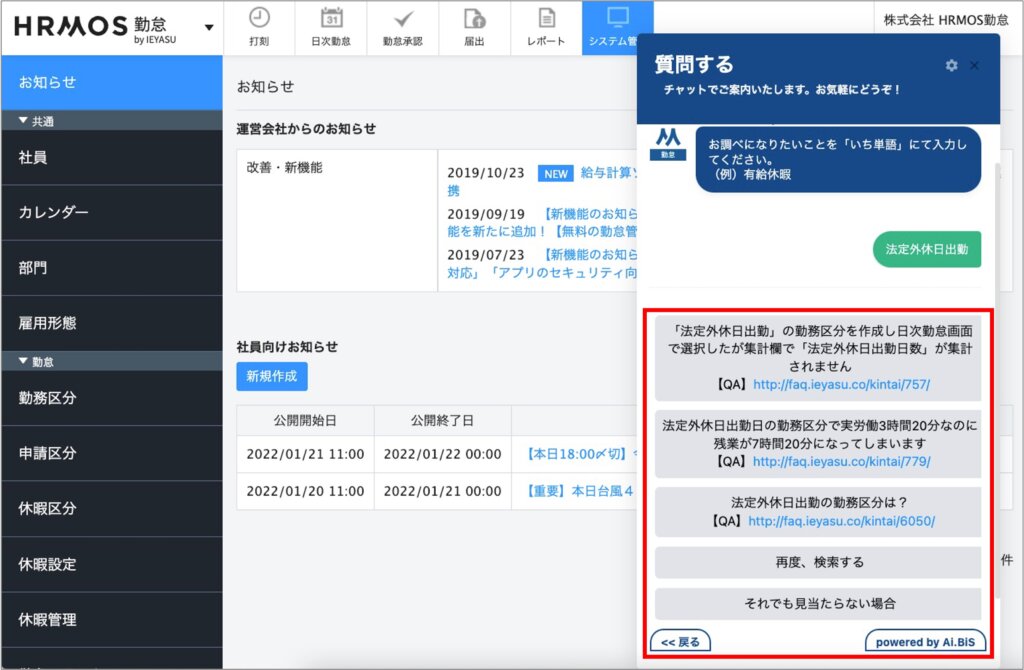 【ハーモス勤怠の使い方】システム管理画面に『質問チャットボット』を追加いたしました