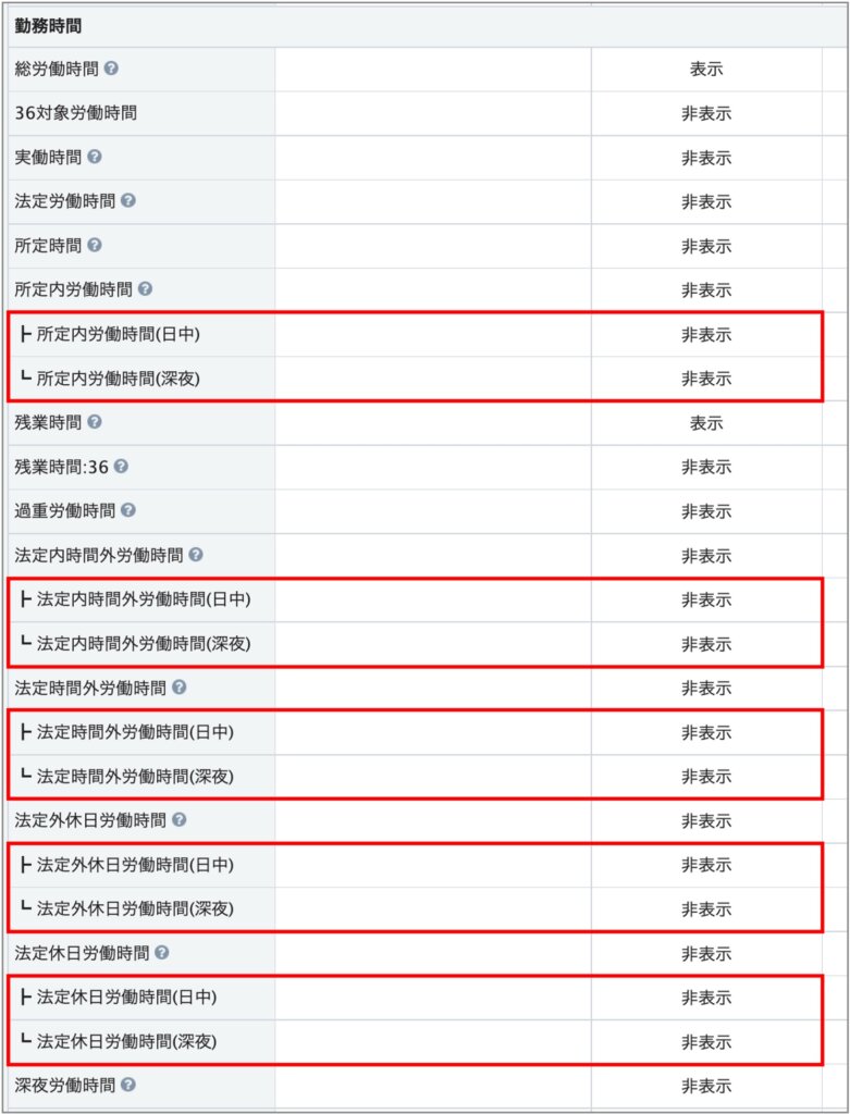 既存の項目である 「所定内労働時間」、「法定内時間外労働時間」、「法定時間外労働時間」、「法定外休日労働時間」、「法定休日労働時間」に、それぞれ「通常時間」と「深夜時間」の内訳項目を追加いたします。
