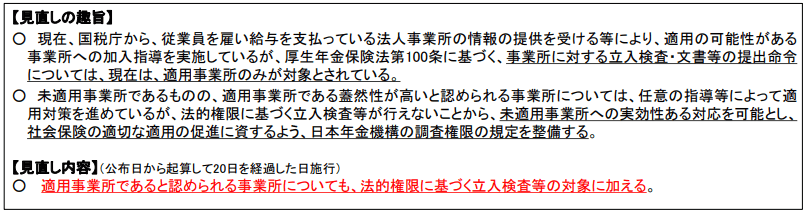 こちらの概要には記載がありませんが、今回の法改正では「厚生年金保険法における日本年金機構の調査権限の整備」として、下記の内容が盛り込まれました。