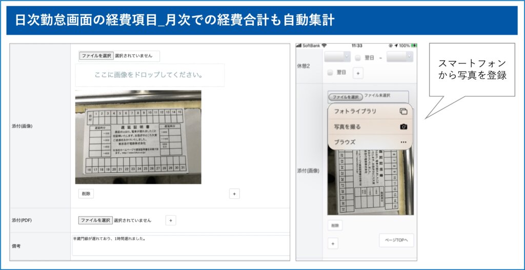 - 日次勤怠画面に領収書や電車の遅延証明書の写真を添付できる機能があるので経費精算も同時にできる