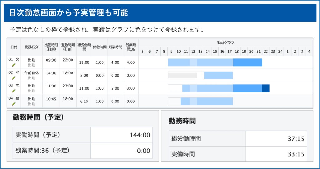 - 日次勤怠画面で、予実がグラフで一目で把握できる点