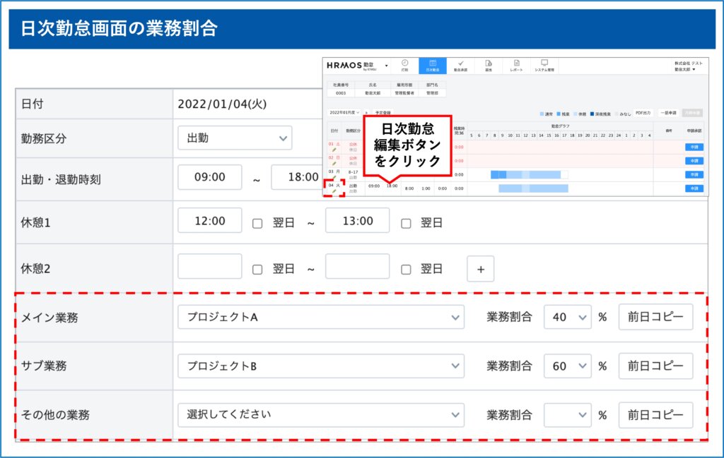 - 日次勤怠画面から業務にどのくらいの時間を割いたかを%で記録できる機能は便利