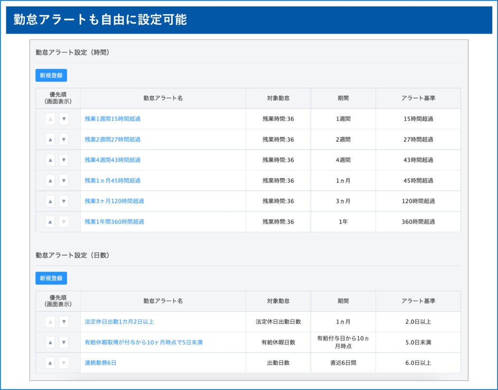 - 勤怠アラートの設定の自由度が高く件数も無制限に設定できる点。また、条件に合わせて社員と管理監督者に別のメッセージを送付することができる。