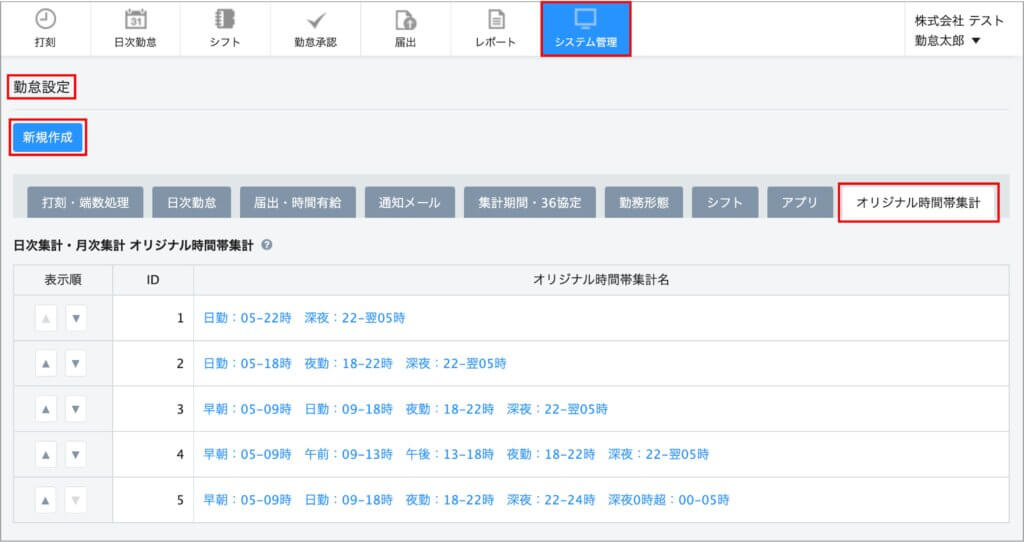 [システム管理>勤怠設定>オリジナル時間帯集計タブ]画面にある「新規作成」ボタンより、オリジナルの時間帯を登録します。