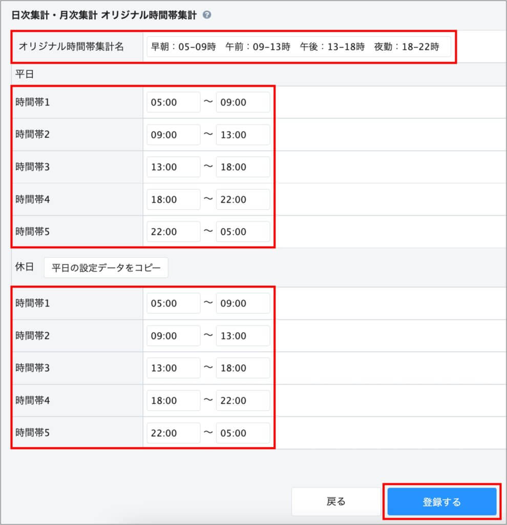 時間帯の名称を記入し、平日・休日ごとの時間帯をそれぞれ記入し「登録する」ボタンをクリックします。
